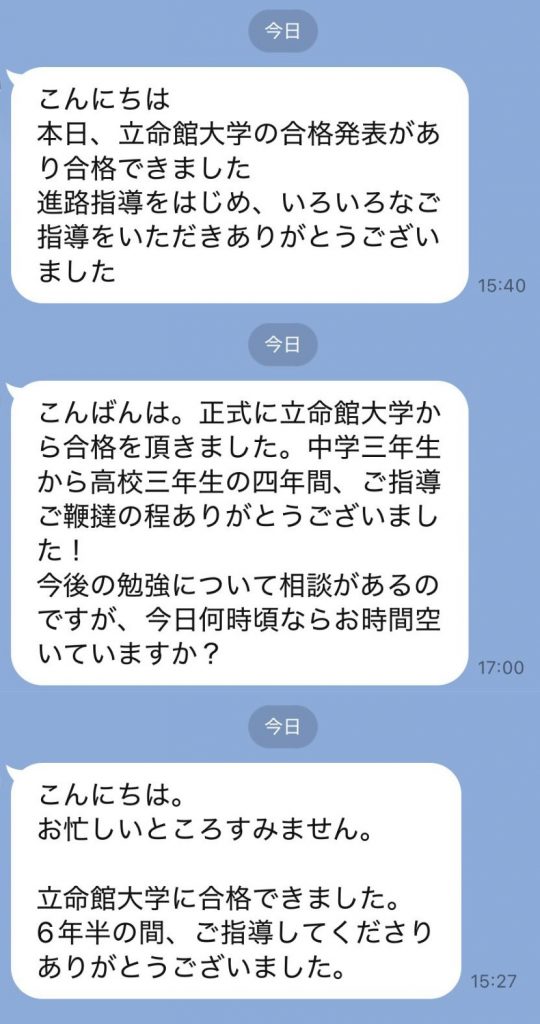 この度、当塾から指定校推薦で大学受験に臨んだ3名の生徒全員が、立命館大学への合格を果たしました。対面授業で学んだ2名、オンラインで学んだ1名、それぞれが十分な内申点を獲得しての合格です。