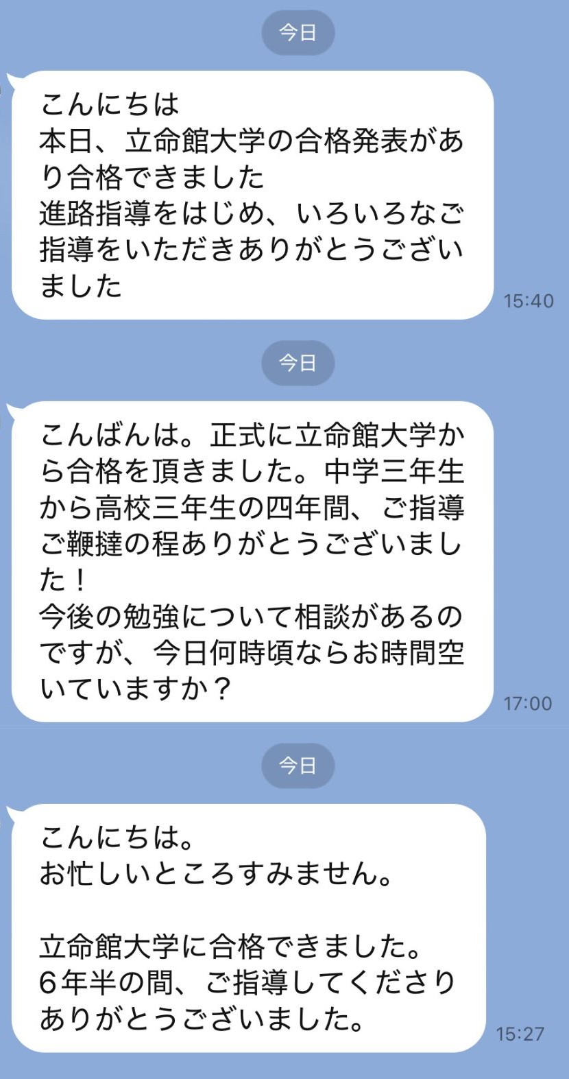 この度、当塾から指定校推薦で大学受験に臨んだ3名の生徒全員が、立命館大学への合格を果たしました。対面授業で学んだ2名、オンラインで学んだ1名、それぞれが十分な内申点を獲得しての合格です。