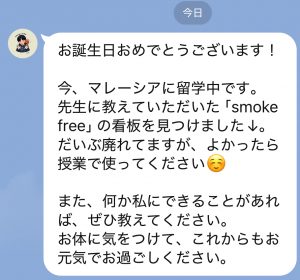 先日、教え子から、誕生日のメッセージと共に一枚の写真が送られてきました。留学先のマレーシアで撮影された「ZON BEBAS ASAP ROKOK / SMOKE FREE ZONE」という禁煙看板の写真です。